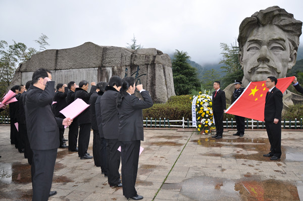 3月14日,在玉山县怀玉山清贫园革命传统教育基地,来自上饶两级法院的院长、纪检组长和上饶中院中层以上领导干部齐聚方志敏塑像前,献花蓝,行躹躬礼,唱革命歌曲,朗诵《可爱的中国》,举手宣誓,用《法官誓词》诠释上饶两级法院千名干警对党、对人民、对宪法和法律的忠诚。
